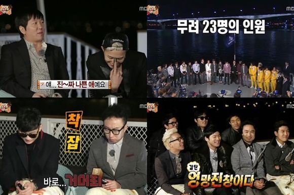 지난 19일 방송된 MBC '무한도전'에서는 무한도전 가요제 멤버들이 선상에 모여 중간점검을 하는 모습이 담겼다. 이날 무려 23명의 참가자들이 선상에 둘러 앉아 가요제를 놓고 열띤 폭로를 해, 웬만한 토크쇼를 능가하는 재미를 선사했다.