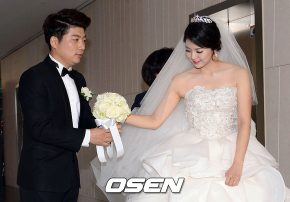 김재욱의 예비신부가 김재욱에게 부케를 건네받고 있다.