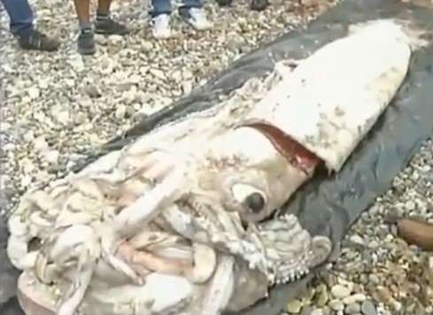 공개된 '180kg 괴물 오징어' 사진 속에는 길이 9m, 몸무게 180kg에 달하는 괴물 오징어의 모습이 담겨 있다. 특히 눈이 일반사람의 머리 크기만해 놀라움을 자아낸다.