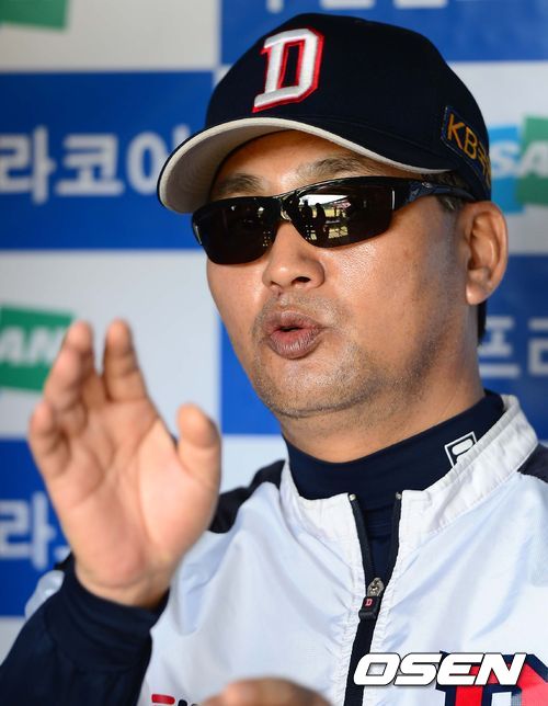 경기에 앞서 두산 김진욱 감독이 취재진과 이야기를 나누고 있다.