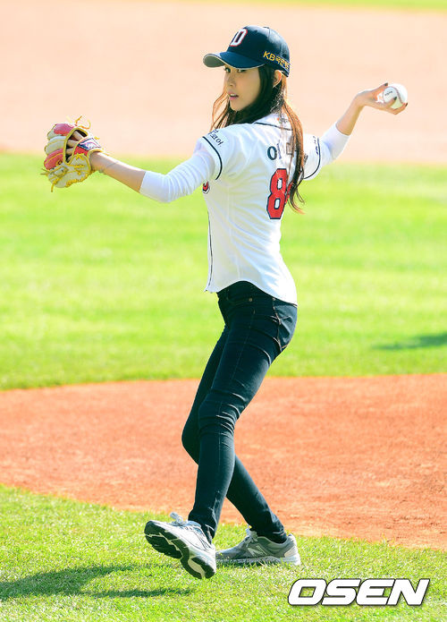 경기에 앞서 배우 이다해가 시구를 하고 있다.