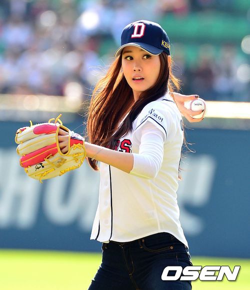 경기에 앞서 배우 이다해가 멋진 폼으로 시구를 하고 있다.