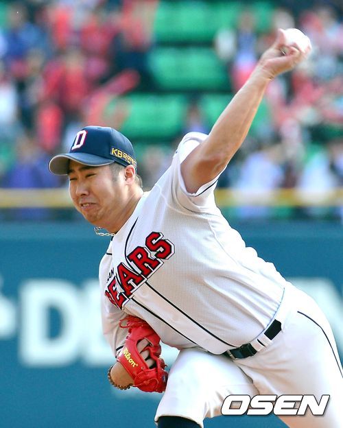 1회초 두산 선발 유희관이 힘차게 공을 던지고 있다.