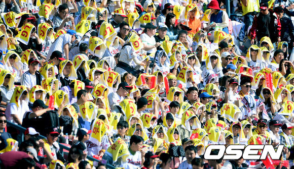 햇살이 강한 청명한 가을 날씨에 LG 팬들이 응원수건으로 얼굴을 가리고 있다.