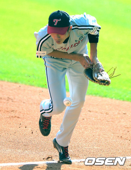 2회말 2사1,2루에서 LG 김용의가 두산 최재훈의 1루 땅볼을 놓치며 실점을 허용하고 있다.