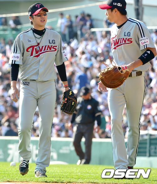 2회말 2사 1,2루 최재훈의 내야땅볼을 어이없는 실책으로 점수를 내준 김용의를 우규민이 격려하고 있다.