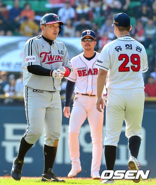 3회초 1사 1루 박용택의 내야땅볼때 2루로 들어가는 1루주자 윤요섭의 발이 높다고 생각한 두산 유격수 김재호가 윤요섭과 설전을 벌이자 유희관이 말리고 있다.