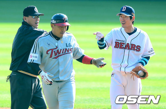 LG 포수 윤요섭과 두산 유격수 김재호가 전날에 이어 주루과정에서 충돌했다.