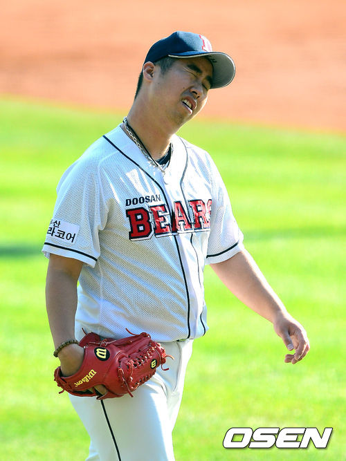 4회초 연속 볼넷으로 위기를 자초한 두산 유희관이 무실점으로 수비를 마치고 안도하고 있다.