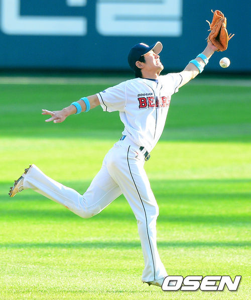 6회초 무사에서 두산 김재호가 LG 권용관의 타구에 점프를 했지만 아쉽게 놓치고 있다.