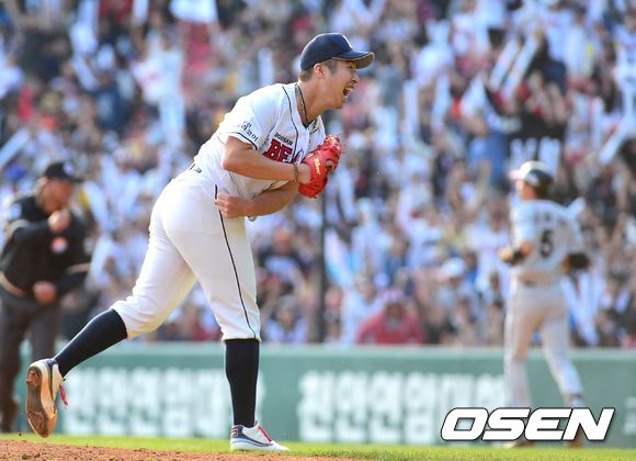 6회초 2사 만루 김용의를 처리하며 만루 위기를 넘긴 유희관이 환호하고 있다.