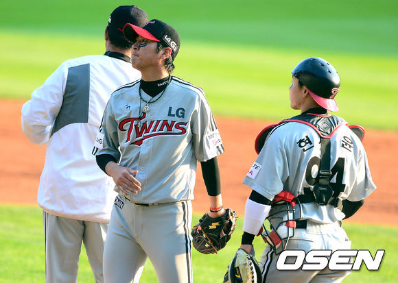 7회말 1사 1루에서 LG 우규민이 두산 김재호에 사구를 허용하고 강판당하고 있다.