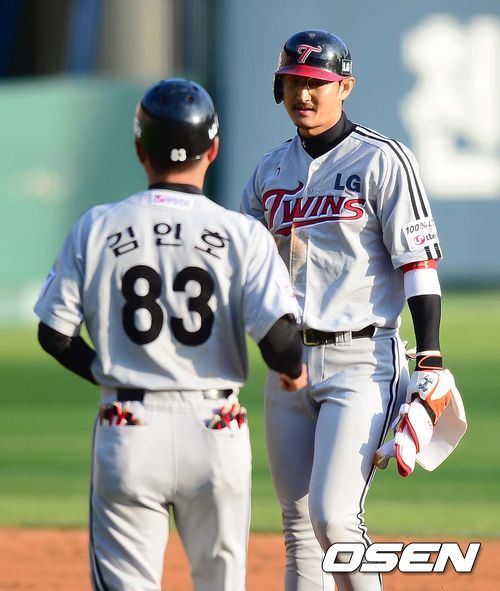 7회초 1사 2루에서 LG 박용택의 동점 적시타를 치고 김인호 코치와 이야기를 나누고 있다.