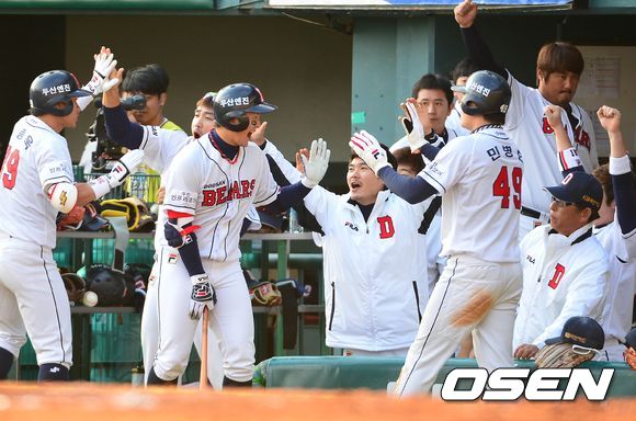 7회말 1사 2,3루 이종욱의 희생플라이때 홈을 밟은 민병헌이 동료들과 기쁨을 나누고 있다.