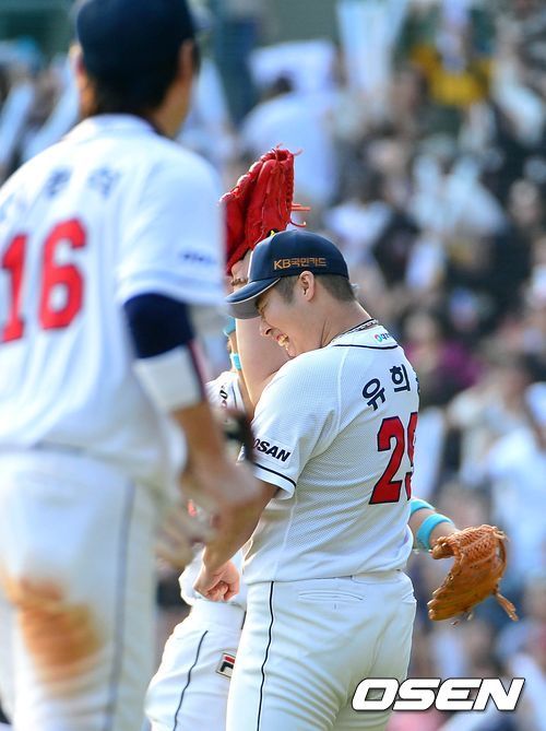 마침 유희관이 감독의 곁을 지나갔다. 김 감독이 “네게 기대가 크다”라고 밝혔고 유희관은 넉살 좋게 “피날레 기회를 주셔서 감사합니다”라며 허리를 굽혀 악수했다. 3차전 승리 후 4차전도 자신이 승리를 이끌어 팀의 플레이오프 성공적인 피날레를 이끌겠다는 공약이었다. 앞서 넥센과의 준플레이오프를 앞두고도 “상대 4번 타자 박병호가 크게 위협적이지는 않다. 반드시 막겠다”라고 밝힌 뒤 정말 제대로 봉쇄했던 유희관이다.