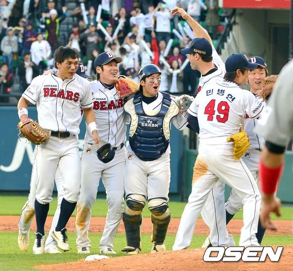 한국시리즈에 진출한 두산 선수들이 승리의 기쁨을 나누고 있다./spjj@osen.co.kr