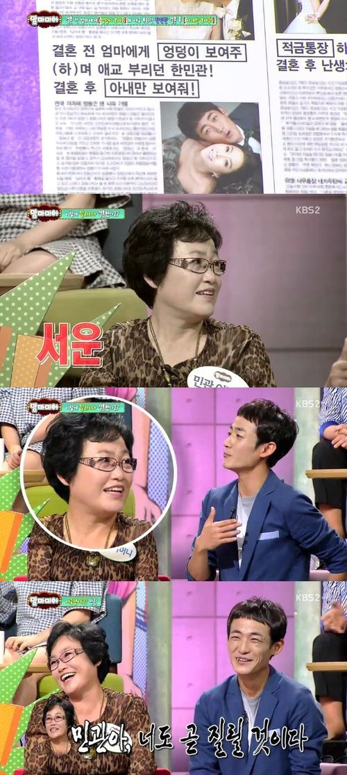 이에 함께 나온 한민관의 어머니는 착찹한 표정을 지었고, MC들은 "어머니 표정관리가 안되신다. 웃으려고 하지만 입꼬리가 잘 안올라가시는 것 같다"라고 말했다. 어머니는 "아들이 스킨십을 잘한다, 설거지를 하면 뒤에 와서 살짝 안고 그랬다"며 "언젠가 또 아내랑 질릴 때가 되면 보여줄 것이다"라고 말해 웃음을 자아냈다.