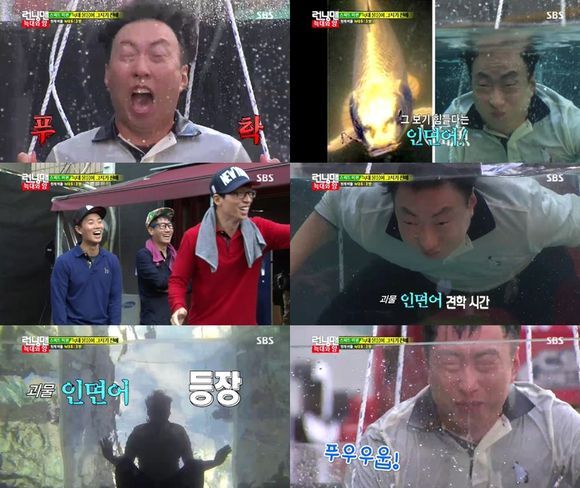 하지만 박명수가 먼저 물에 빠졌고 물에 빠진 박명수를 본 유재석은 "인면어다"라고 소리, 실제로 인면어를 연상케 하는 얼굴은 보는 이들을 폭소케 했다.