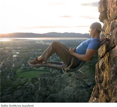 사진 속에서는 암벽 등반가로 보이는 건장한 체격의 청년이 깍아지른 듯한 110m 벼랑에 멋진 철재 의자를 설치하고 절벽 맞은 편 절경을 바라보며 한가롭게 휴식을 취하고 있다. 석양 질 무렵의 멋진 도시 전경을 내려다보년서 110m 벼랑에 설치된 의자에 앉아있는 미남의 모습은 말 그대로 한 폭의 그림이다.