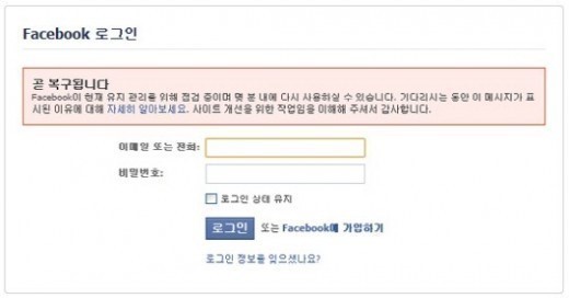 페이스북에 로그인하면 "곧 복구됩니다. 페이스북이 현재 유지 관리를 위해 점검 중이며 몇 분 내에 다시 사용하실 수 있습니다. 사이트 개선을 위한 작업임을 이해해 주셔서 감사합니다"라는 안내 메시지가 보인다.