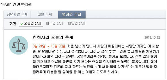 최근 한 포털사이트에서 무료로 오늘의 별자리 운세를 서비스하고 있다. 자신의 생일에 해당되는 별자리를 클릭하기만 하면 오늘의 운세를 볼 수 있다. 간편하게 자신의 하루를 전망해볼 수 있어 네티즌들이 흥미를 갖고 있다.