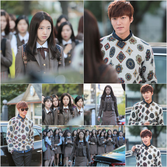 '상속자들’ 이민호-박신혜가 50여명의 여고생에게 둘러싸인 채 교문 앞 ‘격한 재회’를 펼쳤다.