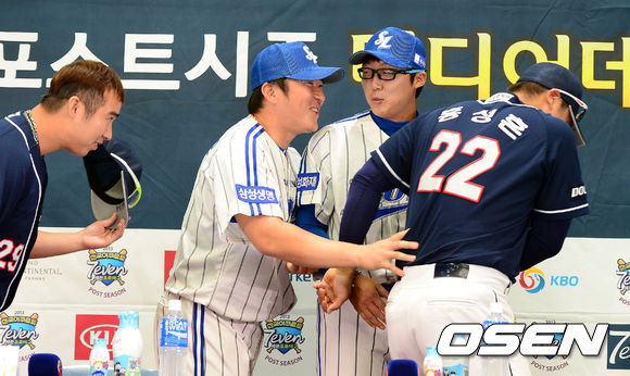 기자회견을 마치고 두산 유희관, 홍성흔이 삼성 최형우, 배영수와 인사를 나누고 있다.