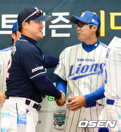 기자회견을 마치고 두산 홍성흔, 삼성 배영수가 인사를 나누고 있다.