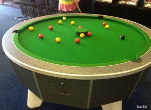 이 사진에 나온 당구대는 기존의 포켓볼 당구대 처럼 직사각형 모양이 아니라, 원형으로 공을 넣을 수 있는 구멍은 세개다.