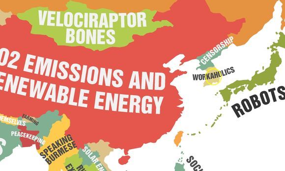 이 지도에 의하면 일본은 '로봇' 미국은 '노벨상 수상자와 잔디깎기 사망' 인도는 '영화' 프랑스는 '관광' 북한은 '검열' 등 다양한 단어들로 표현됐다.