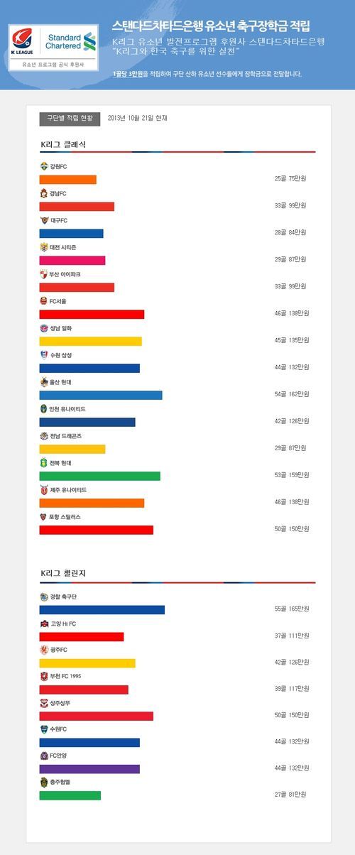 적립내역은 K리그 공식 홈페이지(www.kleague.com), K리그 트위터(www.twitter.com/kleague), K리그 페이스북(www.facebook.com/withKLEAGUE) 등을 통해 매 라운드 종료 후 확인할 수 있다. 10월 24일 현재 K리그 클래식과 챌린지를 통틀어 총 22개 구단 중 경찰축구단이 55골(165만 원 적립)로 가장 많은 유소년 장학금을 적립하고 있다.