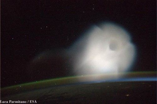 이 사진은 이탈리아의 한 우주인 국제우주정거장에서 촬영해 트위터에 올린 것으로 전해졌다. 공개된 사진 속에는 우주 한 공간에 뿌연 연기 덩어리가 떠 있는 모습이 담겨 있는데 흡사 입을 벌리고 부유하는 유령의 모습처럼 보여 화제가 된 것.