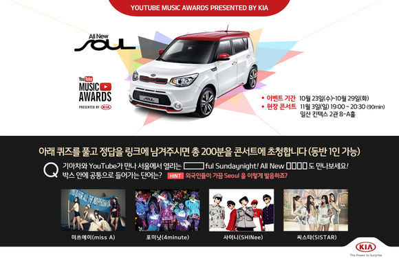 '유튜브 뮤직 어워드'는 세계 최대 동영상 사이트인 유튜브(YouTube)가 한해 동안 전세계 이용자들에게 가장 사랑 받은 아티스트와 음악을 선정하기 위해 마련한 행사로 기아차가 단독 후원하고 있다. 이날 한국공연에는 미스에이, 포미닛, 씨스타, 샤이니 등이 공연을 펼칠 예정이다,
