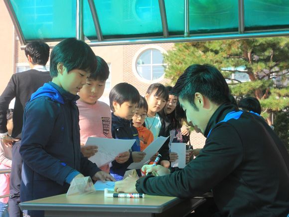 대전 시티즌 이웅희, 이동현, 김성수, 김평진이 24일 오전 대전 전민초등학교를 방문해 사인회를 열었다. 전민초등학교의 4, 5, 6학년 축구대회 결승전을 맞아 대전 시티즌 선수단이 깜짝 방문한 것이다. 어린이들은 즐거워하며 선수들과 인사를 나누고 사인을 받았다.
