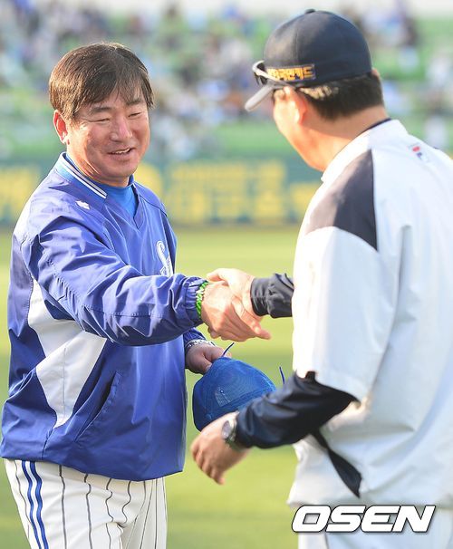 24일 오후 대구구장에서 열리는 '2013 한국야쿠르트 세븐 프로야구' 한국시리즈 삼성 라이온즈와 두산 베어스의 1차전, 삼성 류중일 감독과 두산 김진욱 감독이 인사를 나누고 있다.