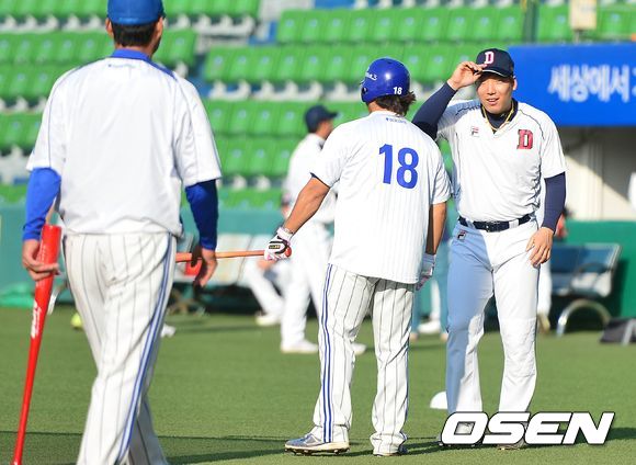 24일 오후 대구구장에서 열리는 '2013 한국야쿠르트 세븐 프로야구' 한국시리즈 삼성 라이온즈와 두산 베어스의 1차전, 두산 김현수가 훈련중인 삼성 선수단과 인사를 나누고 있다.