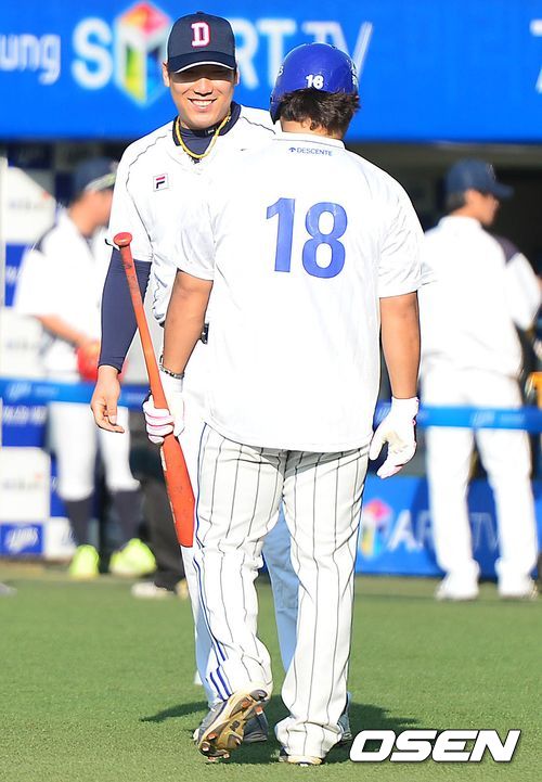 24일 오후 대구구장에서 열리는 '2013 한국야쿠르트 세븐 프로야구' 한국시리즈 삼성 라이온즈와 두산 베어스의 1차전, 두산 김현수와 삼성 박석민이 인사를 나누고 있다.