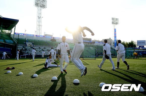 24일 오후 대구구장에서 열리는 '2013 한국야쿠르트 세븐 프로야구' 한국시리즈 삼성 라이온즈와 두산 베어스의 1차전, 두산 선수들이 그라운드에서 몸을 풀고 있다.
