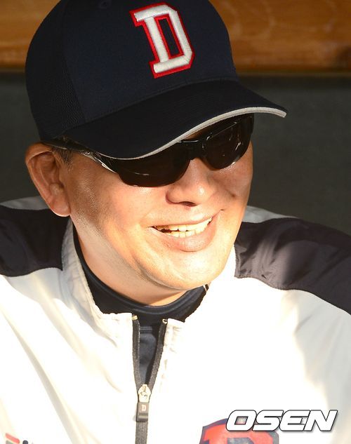 24일 오후 대구구장에서 열리는 '2013 한국야쿠르트 세븐 프로야구' 한국시리즈 삼성 라이온즈와 두산 베어스의 1차전, 두산 김진욱 감독이 취재진과 대화를 나누고 있다.