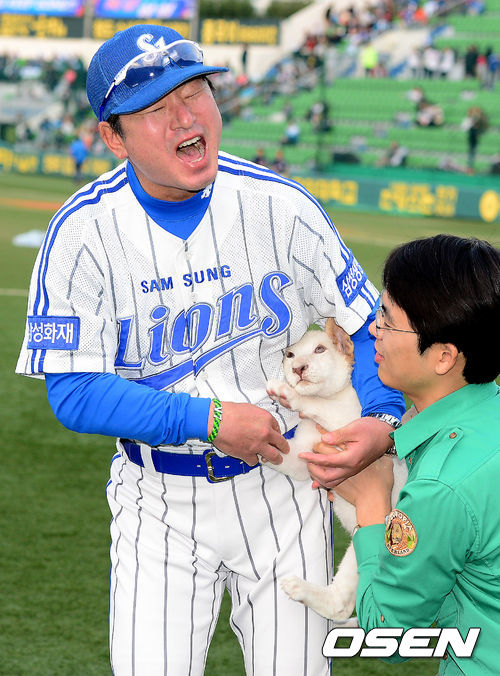 24일 오후 대구구장에서 열리는 '2013 한국야쿠르트 세븐 프로야구' 한국시리즈 삼성 라이온즈와 두산 베어스의 1차전, 경기에 앞서 삼성 류중일 감독이 '행운의 상징'으로 불리는 에버랜드의 아기 백사자와 포즈를 취하고 있다.