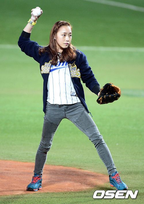 24일 오후 대구구장에서 열리는 '2013 한국야쿠르트 세븐 프로야구' 한국시리즈 삼성 라이온즈와 두산 베어스의 1차전 록클라이머 김자인이 멋진 폼으로 시구를 하고 있다.
