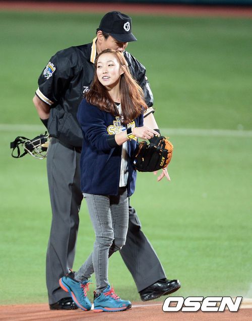 24일 오후 대구구장에서 열리는 '2013 한국야쿠르트 세븐 프로야구' 한국시리즈 삼성 라이온즈와 두산 베어스의 1차전 록클라이머 김자인이 멋진 폼으로 시구를 하고 있다.