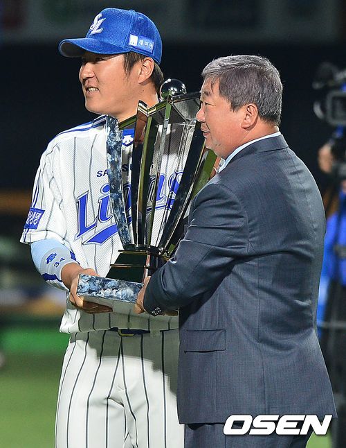 24일 오후 대구구장에서 열린 '2013 한국야쿠르트 세븐 프로야구' 한국시리즈 삼성 라이온즈와 두산 베어스의 1차전, 경기 시작에 앞서 페넌트레이스 우승을 거머쥔 삼성 주장 최형우가 구본능 KBO총재로부터 트로피를 전달받 은 뒤 포즈를 취하고 있다.