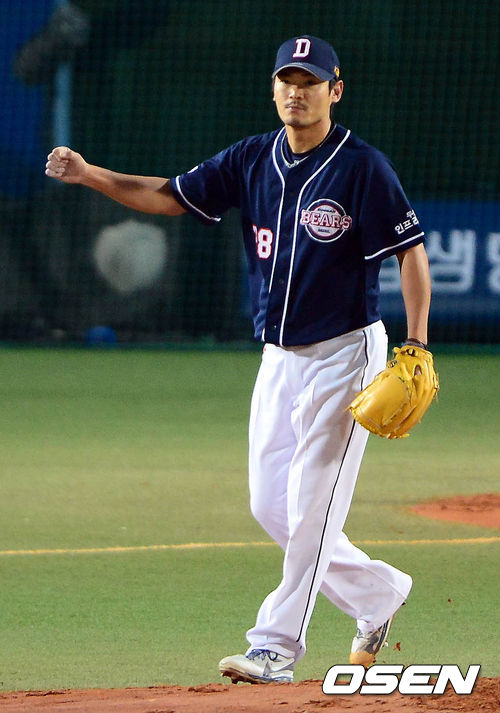 24일 오후 대구구장에서 열린 '2013 한국야쿠르트 세븐 프로야구' 한국시리즈 1차전 삼성 라이온즈와 두산 베어스의 경기 1회말 선두타자 배영섭을 삼진으로 노경은이 주먹을 불끈 쥐고 있다.