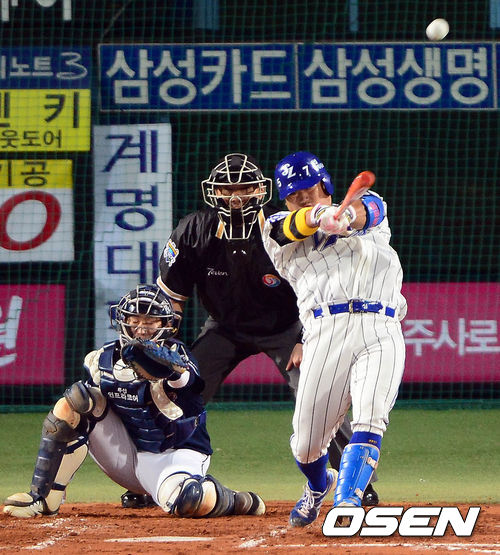 24일 오후 대구구장에서 열린 '2013 한국야쿠르트 세븐 프로야구' 한국시리즈 1차전 삼성 라이온즈와 두산 베어스의 경기 1회말 2사 박석민이 솔로포를 치고 있다.