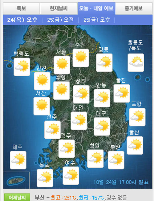 기상청은 현재, 북서쪽에서 다가오는 고기압의 영향으로 전국이 대체로 맑으나 경상남북도해안은 동풍의 영향으로 가끔 구름많은 날씨를 보이고 있다고 전했다.