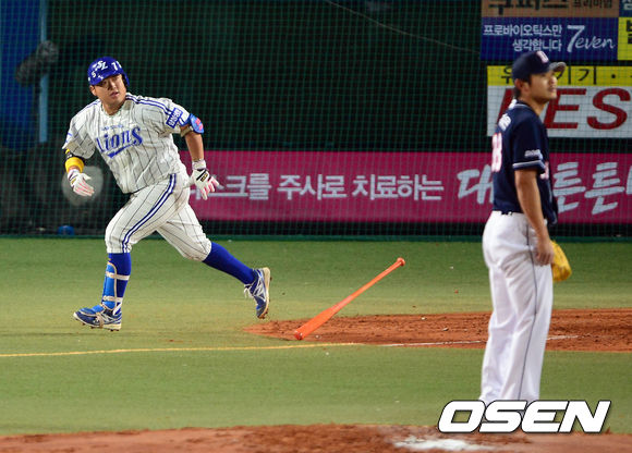 24일 오후 대구구장에서 열린 '2013 한국야쿠르트 세븐 프로야구' 한국시리즈 1차전 삼성 라이온즈와 두산 베어스의 경기 1회말 2사 박석민이 솔로포를 치고 날아가는 타구를 바라보고 있다.