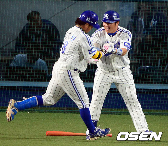 24일 오후 대구구장에서 열린 '2013 한국야쿠르트 세븐 프로야구' 한국시리즈 1차전 삼성 라이온즈와 두산 베어스의 경기 1회말 2사 박석민이 솔로포를 치고 덕아웃으로 향하며 최형우와 하이파이브를 하고 있다.