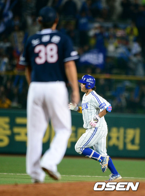 24일 오후 대구구장에서 열린 '2013 한국야쿠르트 세븐 프로야구' 한국시리즈 삼성 라이온즈와 두산 베어스의 1차전, 1회말 2사에서 삼성 박석민이 선제 솔로포를 날리고 그라운드를 돌고 있다.