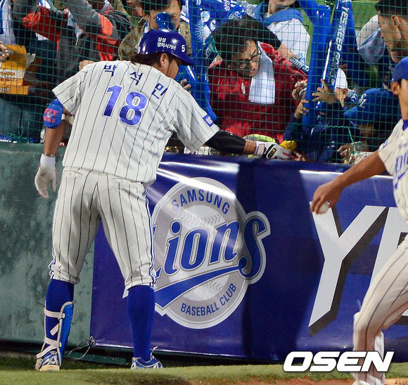 24일 오후 대구구장에서 열린 '2013 한국야쿠르트 세븐 프로야구' 한국시리즈 1차전 삼성 라이온즈와 두산 베어스의 경기 1회말 2사 박석민이 솔로포를 치고 마스코트 인형을 어린이 팬에게 전달하고 있다.